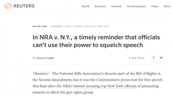 In 2018, the ACLU successfully defended the National Rifle Association (NRA) in suing Gov. Andrew Cuomo and New York State on the ground that attempts of state officials to coerce private companies to cease doing business with the NRA using implicit threats — driven by Cuomo’s contempt for the NRA’s political views — amounted to a violation of the First Amendment. Because, argued the ACLU, the communications of Cuomo’s aides to banks and insurance firms “could reasonably be interpreted as a threat of retaliatory enforcement against firms that do not sever ties with gun promotion groups,” that conduct ran afoul of the well-established principle “that the government may violate the First Amendment through ‘action that falls short of a direct prohibition against speech,’ including by retaliation or threats of retaliation against speakers.” In sum, argued the civil liberties group in reasoning accepted by the court: