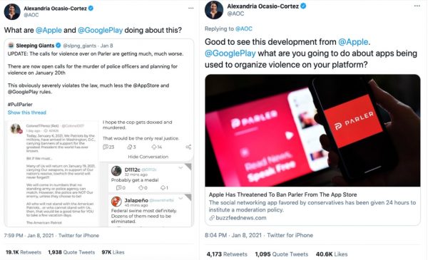 Within twenty-four hours, all three Silicon Valley companies complied with these “requests,” and took the extraordinary step of effectively removing Parler — at the time the most-downloaded app on the Apple Store — from the internet. We will likely never know what precise role those tweets and other pressure from liberal politicians and journalists played in their decisions, but what is clear is that Democrats are more than willing to use their power and platforms to issue instructions to Silicon Valley about what they should and should not permit to be heard.
