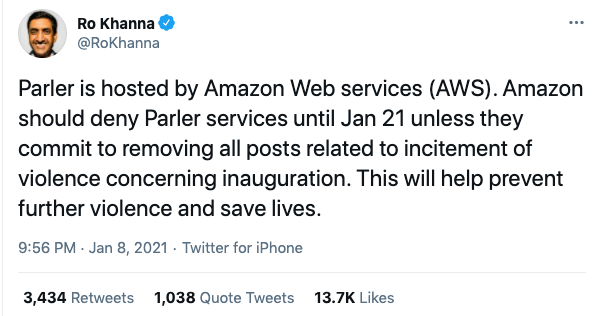 This dynamic has become so common that Democrats now openly pressure Silicon Valley companies to censor content they dislike. In the immediate aftermath of the January 6 Capitol riot, when it was falsely claimed that Parler was the key online venue for the riot’s planning — Facebook, Google’s YouTube and Facebook’s Instagram were all more significant — two of the most prominent Democratic House members, Rep. Alexandria Ocasio-Cortez (D-NY) and Rep. Ro Khanna (D-CA), used their large social media platforms to insist that Silicon Valley monopolies remove Parler from their app stores and hosting services: