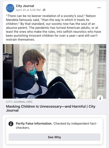 Unfortunately, these tactics seem to be succeeding. Oregon’s young athletes may have gotten a reprieve from the mask mandate, but many others aren’t so lucky. They’re still wearing masks as they sprint down soccer fields. Little Leaguers still wear masks as they stand alone in the outfield. Four-year-olds still wear masks on the playground, and vaccinated teachers still teach classes of masked students. Facebook and Science Feedback are using their “fight against misinformation” as a weapon to spread their own version of it.