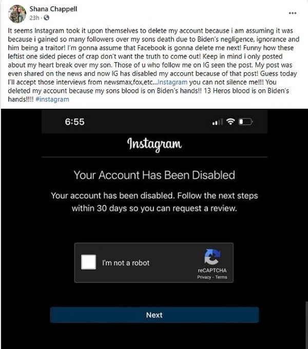 On Facebook, Chappell has repeatedly blamed Biden for her son’s death and in a post on Monday just before she had her Instagram account disabled, she wrote a long Facebook post directed at Biden where she described meeting him on Sunday at Dover Air Base.